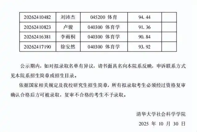10月30日,清华大学社会科学学院对清华大学2026年社会科学学院接收推荐免试直硕生拟录取名单进行公示。孙颖莎以综合考核成绩92.04拟录取体育专业,王曼昱以综合考核成绩89.44拟录取体育专业。