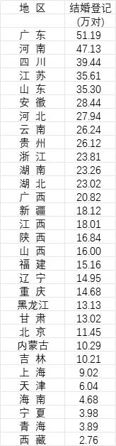 数据显示,去年我国结婚总人数最多的是广东省,为51.19万对,也是去年全国唯一一个结婚登记超过50万对的省份,且已连续三年位居全国第一。其中,去年广东初婚人数为83.19万人,再婚人数为19.19万人。