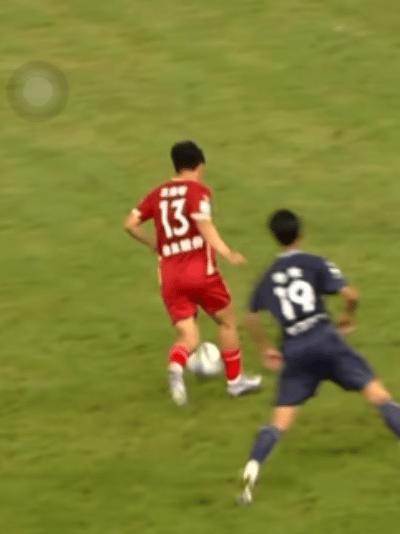 第一粒进球发生在开场第31分钟。泰州队的角球机会,4号球员郑博走向角球区,角球开出,双方球员争抢第一落点,门前陷入混战——泰州队巴特侧身,调整重心,完美的倒挂金钩进球。
