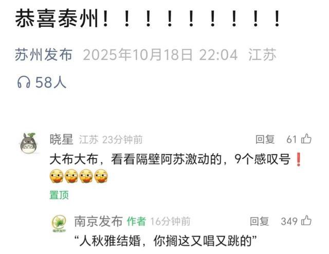 “梗”的存在感,没有随着一轮轮比赛的推进和队伍的不断淘汰而变淡。省会南京憾负泰州、止步四强时,连八强都没进的“全省GDP扛把子”苏州,在官方宣传时连打九个感叹号:“恭喜泰州!!!!!!!!!”而隔壁南京被问及如何看待苏州此举时,淡淡地引用了一句影视台词回击——“人秋雅结婚,你搁这又唱又跳的”。虽然后来这句话删掉了,但网友还是感慨:这才是那个熟悉的散装江苏。