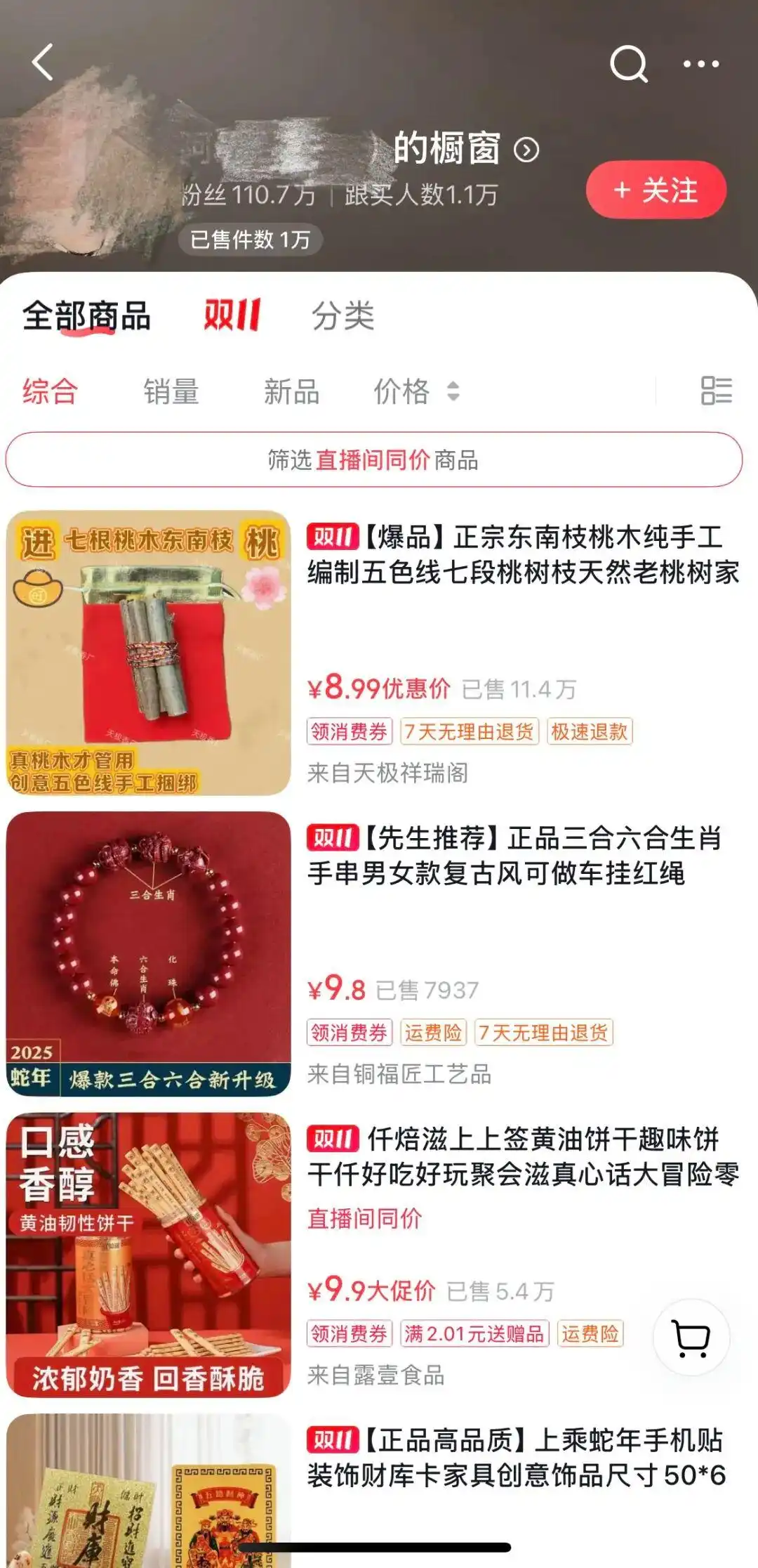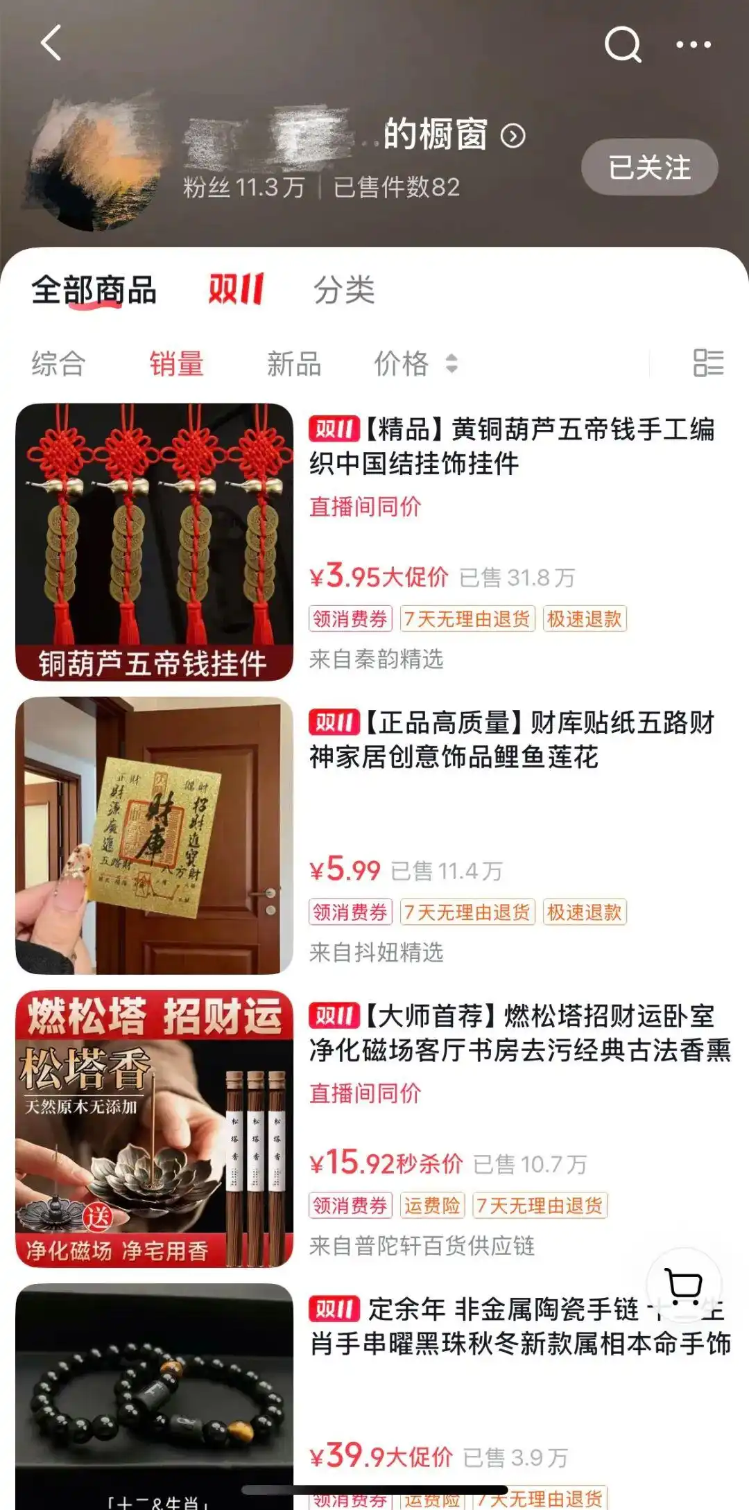 此外,多名博主在视频中频繁推荐“改运”商品,如“山鬼花钱挂件”“三合六合手串”等,并引导用户进入其电商橱窗购买。部分博主还会在直播中展示“好运周边”,如木葫芦、小宝剑等,暗示观众“破霉运”需购买同款。