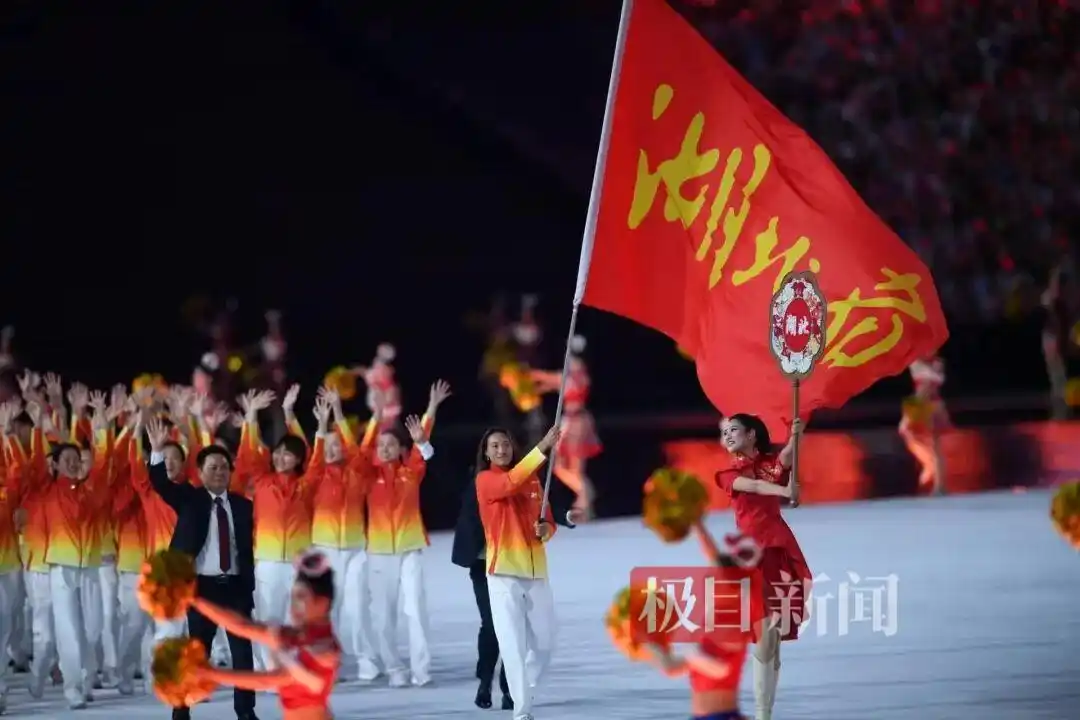 开幕式现场,各参赛代表团代表依次入场亮相。极目新闻记者看到,当湖北体育代表团入场时,走在队伍最前面的旗手是巴黎奥运会网球女子单打冠军郑钦文。