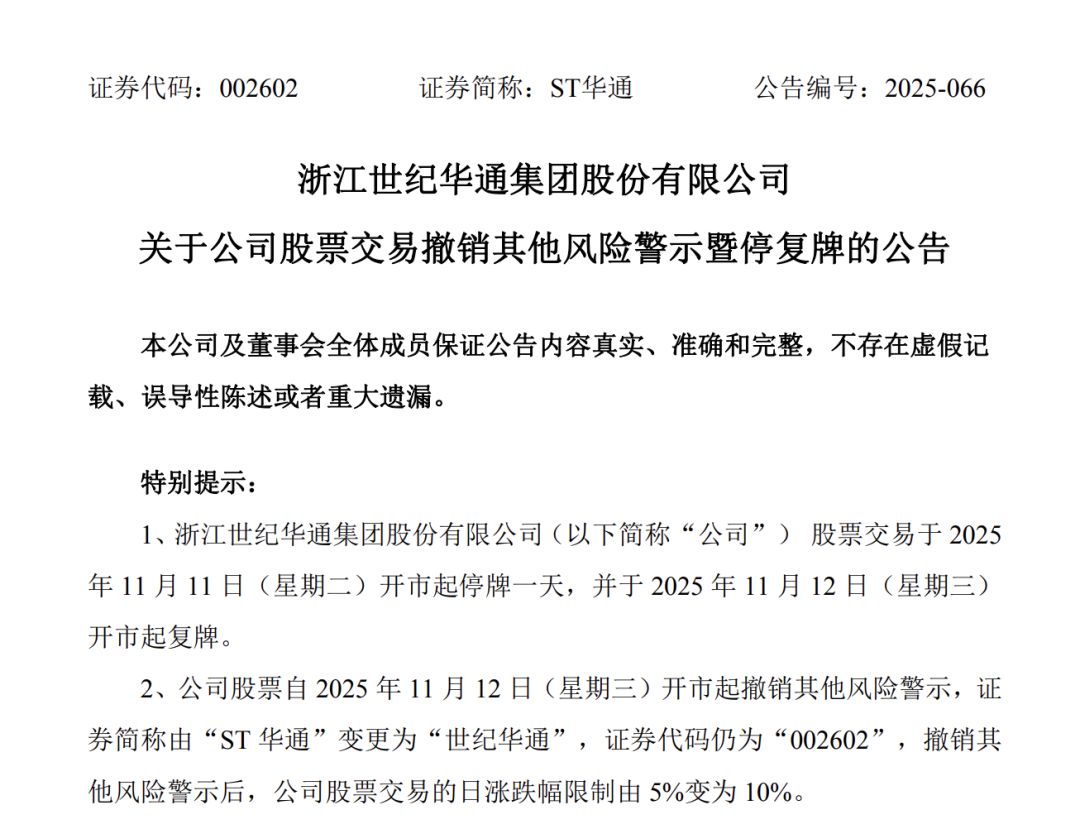 根据深交所规定,世纪华通将于11月11日停牌1天,11月12日开市起复牌并撤销其他风险警示,股票简称将由“ST华通”变更恢复为“世纪华通”,证券代码仍为“002602”。撤销其他风险警示后,公司股票交易的日涨跌幅限制由5%变为10%。