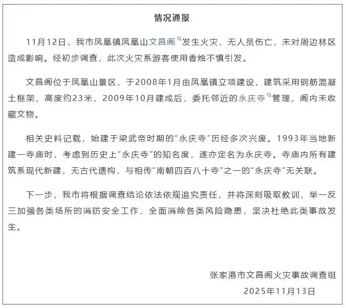 11月12日,我市凤凰镇凤凰山文昌阁发生火灾,无人员伤亡,未对周边林区造成影响。经初步调查,此次火灾系游客使用香烛不慎引发。文昌阁位于凤凰山景区,于2008年1月由凤凰镇立项建设,建筑采用钢筋混凝土框架,高度约23米,2009年10月建成后,委托邻近的永庆寺管理,阁内未收藏文物。相关史料记载,始建于梁武帝时期的“永庆寺”历经多次兴废。1993年当地新建一寺庙时,考虑到历史上“永庆寺”的知名度,遂亦定名为永庆寺。寺庙内所有建筑系现代新建,无古代遗构,与相传“南朝四百八十寺”之一的“永庆寺”无关联。下一步,我市将根据调查结论依法依规追究责任,并将深刻吸取教训,举一反三加强各类场所的消防安全工作,全面消除各类风险隐患,坚决杜绝此类事故发生。