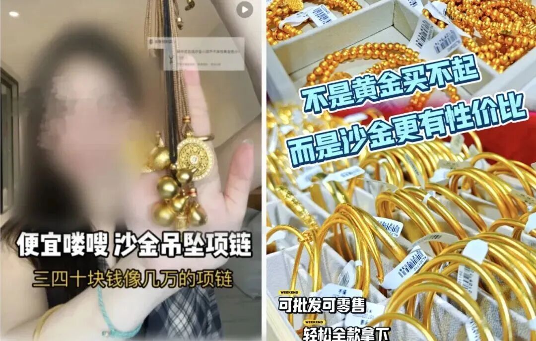 有不少人不想花大钱买金饰,就看上了一种平替——“沙金”。有商家宣称,这些产品和黄金一样,不掉色不怕火烧,价格只要几十上百元。