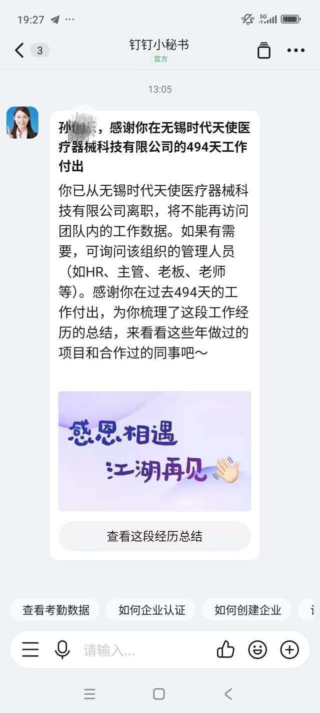 公司方面认为小乐是自行摔伤。小乐去世两小时后,工作账号显示离职状态。孙女士提供的小乐工作账号11月8日13时05分的提示消息称:孙某乐,感谢你在无锡时代天使医疗器械科技有限公司的494天工作付出,你已从无锡时代天使医疗器械科技有限公司离职,将不能再访问团队内的工作数据。