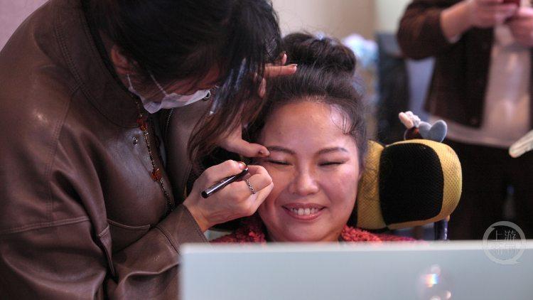 “请把我的小眼睛化得大一点哦!”在化妆时,刘洁俏皮地通过眼球控制仪,跟化妆师说。