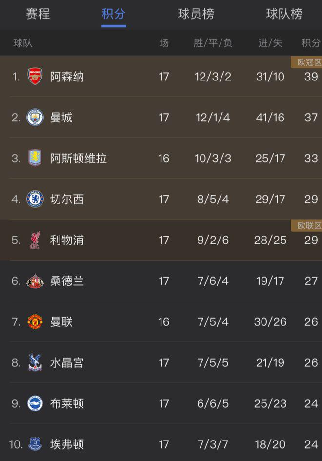 北京时间 12 月 21 日,英超第 17 轮先赛 8 场。两支争冠队阿森纳和曼城都取得胜利,其中阿森纳更是锁定英超圣诞冠军。在一场强强对话中,利物浦客场 2-1 力挫热刺豪取 3 连胜,积分成功追平本轮被纽卡逼平的切尔西。而 " 副班长 " 狼队 0-2 不敌布伦特瑞福德,英超遭遇 10 连败继续垫底。