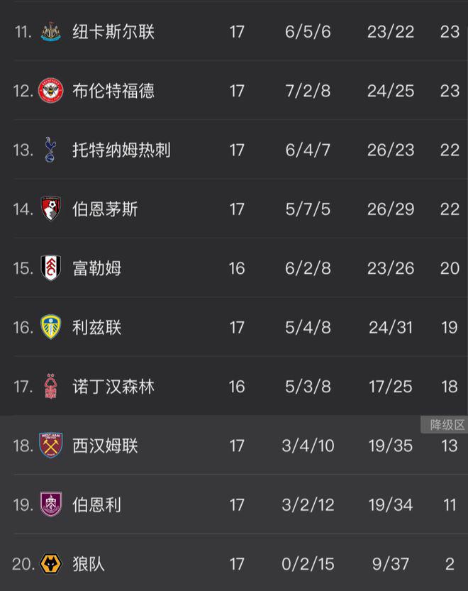 而英超中资队狼队本轮依然萎靡不振,0-2 不敌布伦特福德后,遭遇英超 10 连败,开局 17 轮不胜追平了英超纪录。狼队基本锁定了一个英超降级名额。