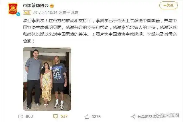 此前据体坛周报报道,2023年7月24日,中国篮协晒出一张姚明、李凯尔以及李凯尔母亲的合影,宣布这位归化球员正式获得中国国籍。今夏,李凯尔将身披中国男篮战袍出现在男篮世界杯的舞台上,帮助中国队冲击巴黎奥运会门票。