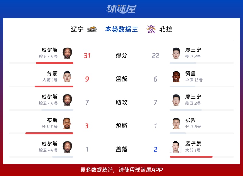 辽宁的威尔斯,致胜功臣。上场31分钟,投篮17投10中,三分9投6中,罚球6罚5中,砍下31分3篮板7助攻2抢断1盖帽,投篮命中率59%,三分命中率67%。
