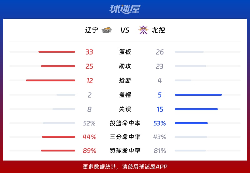 辽宁vs北控:得分98-86、篮板33-26、助攻25-23、抢断12-4、盖帽2-5、失误8-15、投篮命中率52%-53%、三分命中率44%-43%、罚球命中率89%-81%