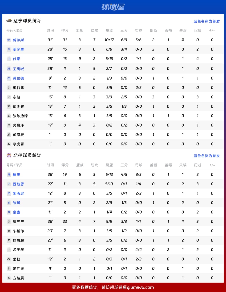 辽宁:威尔斯31分、姜宇星15分、付豪13分、王岚嵚4分、莫兰德2分