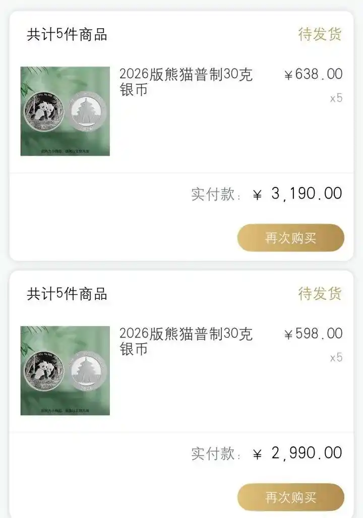 陆先生是一位白银投资新手。因为白银的连日大涨,12月25日,A股市场唯一一只白银基金“国投白银LOF”宣布停版和限购,陆先生决定入手实物白银——临睡前花2990元下单了5枚30克的2026版普制非精装熊猫币(裸币),一枚熊猫币的预售价为598元。