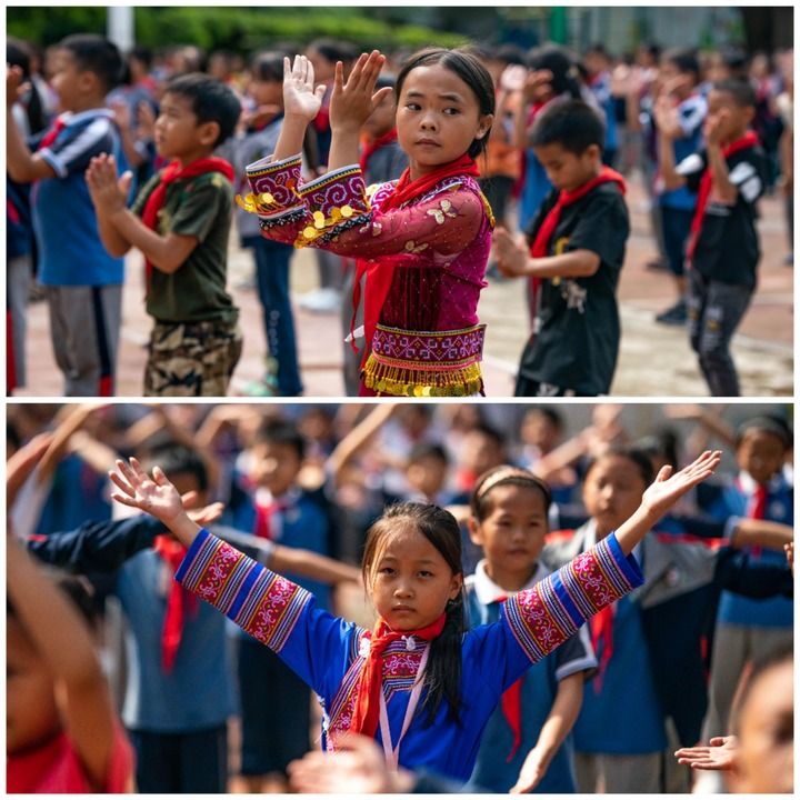 不爱动的女生也被“赶出”教室晒太阳,30分钟的大课间开始,师生们一起做起民族操,两套下来,大家头上都挂着细汗。