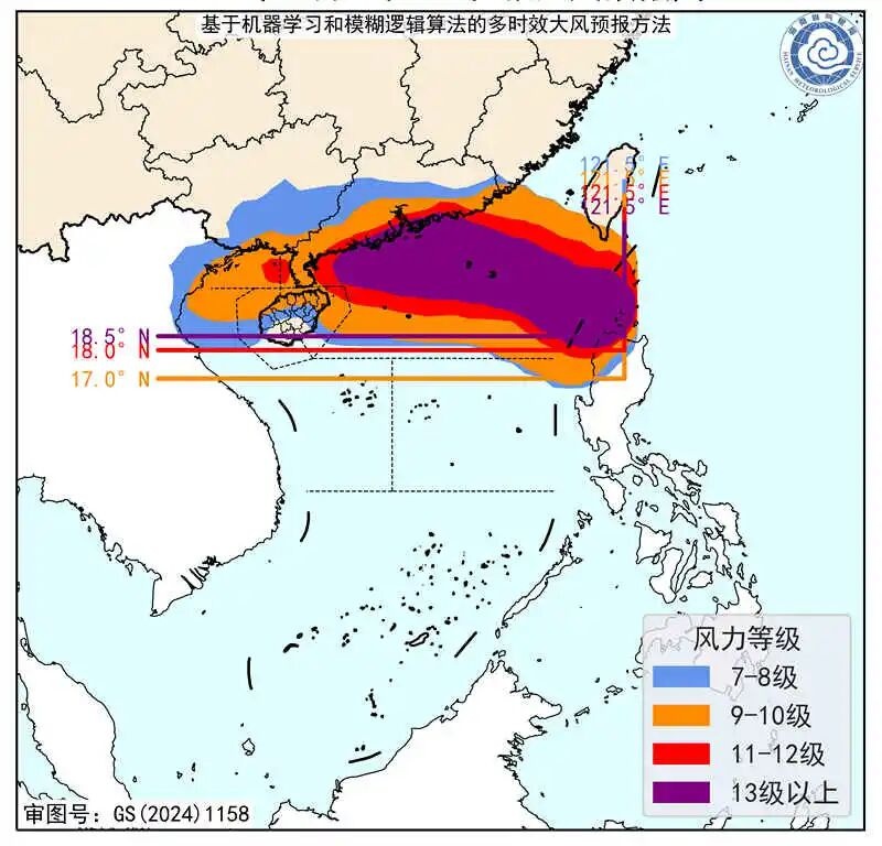 24日~25日,南海北部海面风力14~17级;海南岛四周海面和北部湾海面风力将自东向西逐渐增大到11~12级、阵风13~14级;中沙和西沙群岛附近海面风力7~9级、阵风10~11级;南沙群岛附近海面风力6~7级、阵风8~9级。