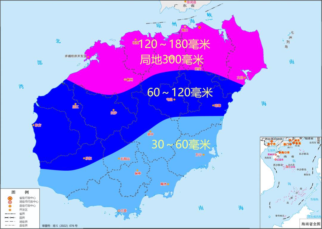 预计,24日08时~26日08时各地累积雨量:海口、文昌、临高、澄迈和儋州等市县120~180毫米、局地300毫米;琼海、定安、屯昌、琼中、白沙、五指山、昌江、乐东和东方等市县60~120毫米,万宁、陵水、保亭和三亚等市县30~60毫米。