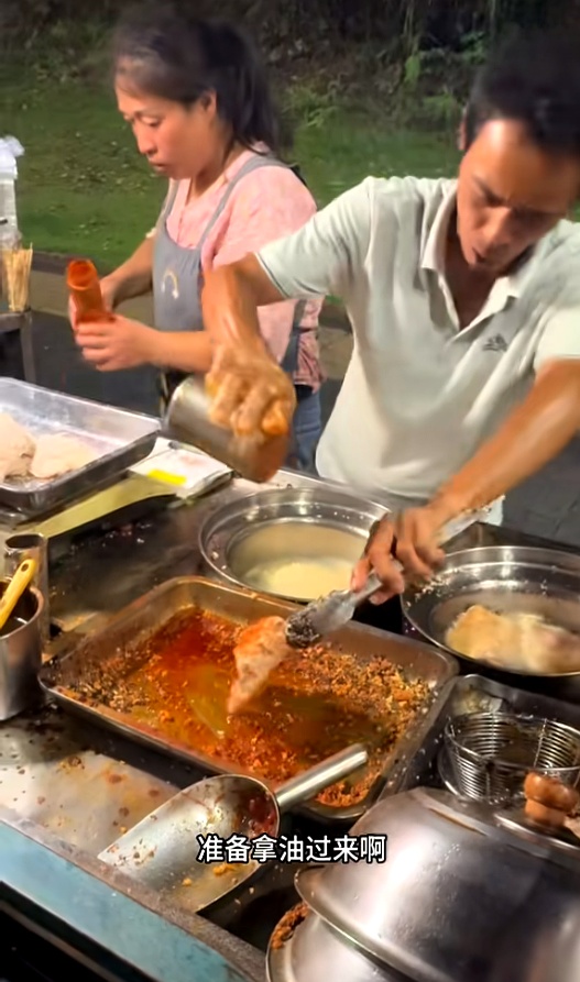 鸡排哥没蹭流量,第二天照样四点半收摊,只是把老婆拉到镜头前介绍:这是我媳妇,以后一起干。