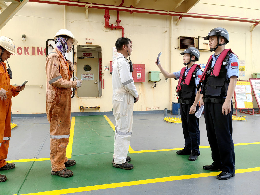 在船舶移泊避风与货物抢卸关键阶段,湛江边检站深化口岸联检单位联动,开通出入境船舶紧急通道。针对需抢卸货物的船舶,主动对接相关单位建立信息互通机制,实时跟进台风动态与作业进度,高效办理通关手续。9月22日,湛江港调顺岛港区新加坡籍“东方牡丹”轮载运7.7万吨煤炭,在边检民警全程协助下,于台风来临前完成7.54万吨货物抢卸,既保障企业生产原料供应,又避免船舶滞留损失。