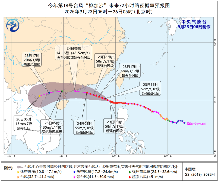 台风“桦加沙”(超强台风级)今天凌晨已进入我国南海。9月23日05时,台风“桦加沙”中心位于距离广东省阳江市东偏南方向约750公里的洋面上,中心附近最大风力17级,达到58米/秒的风速,中心最低气压920百帕,将以每小时20公里左右的速度向西偏北方向移动,强度变化不大,将于24日在广东深圳到徐闻一带沿海登陆(强台风级或超强台风级,14至16级,45至52米/秒),登陆后转向偏西方向移动,强度逐渐减弱。受台风“桦加沙”影响,我市风雨逐渐明显。今日我市白天多云转雷阵雨;23日夜间-25日,有一次大暴雨,局部特大暴雨降水过程,阵风逐渐加大至10-12级,沿海、高地和空旷地区14级左右。请做好防御。