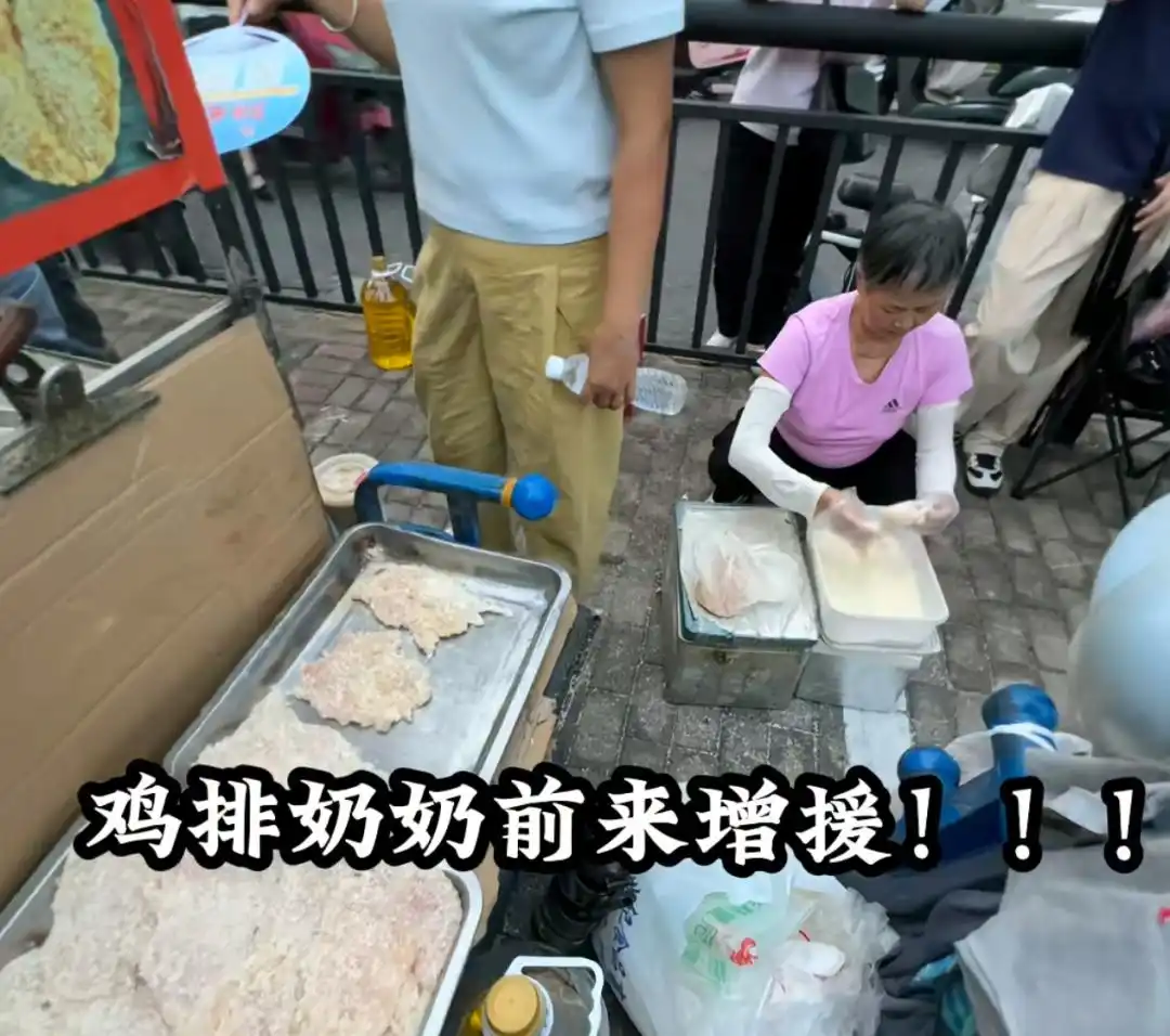由于生意太好,鸡排主理人的家属亲戚都赶来做外援,网友亲切地称呼他们为“鸡排世家”,每天都会解锁新人物,鸡排嫂、鸡排舅、鸡排奶奶、鸡排侄儿...鸡排哥的妈妈,也就是鸡排奶奶帮忙给鸡排蘸粉,“鸡排奶奶”笑着说:“早上5点起来剪鸡排,凌晨一点睡。”