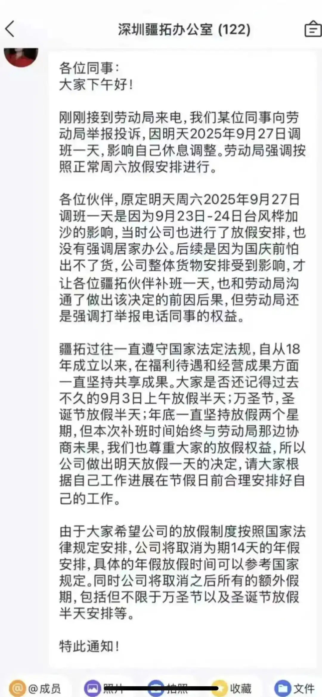 9月27日,深圳市一公司因此前台风放假耽误了工期,要求员工在27日(周六)当天补班一天,结果被员工投诉至劳动部门。当天该公司发布通知,满足员工要求,27日不调班,但将调整公司放假制度,取消员工14天年假福利及所有额外假期。此事引发网友讨论。