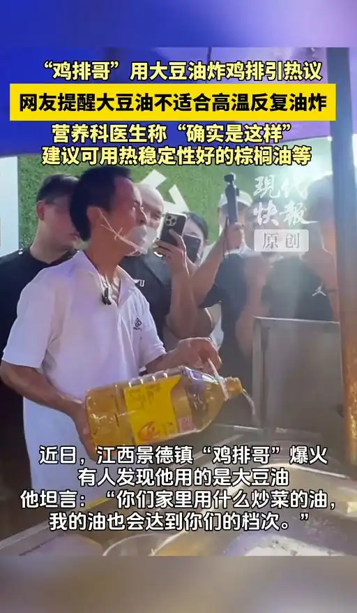 随着江西景德镇“鸡排哥”的爆火,越来越多人前往他的摊位旁消费“打卡”。有人发现鸡排哥炸鸡排用的是某品牌的非转基因大豆油。他坦言:“你们家里用什么炒菜的油,我的油也会达到你们的档次。”