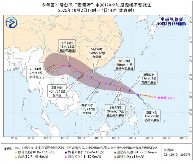 10月2日8时,2025年第21号台风“麦德姆”在菲律宾东部洋面上生成。广东气象部门预计,“麦德姆”将于3日穿过菲律宾吕宋岛后夜间移入南海,强度逐渐加强,并于5日在粤西到海南岛东部之间的沿海地区登陆,较大可能5日白天正面袭击雷州半岛。