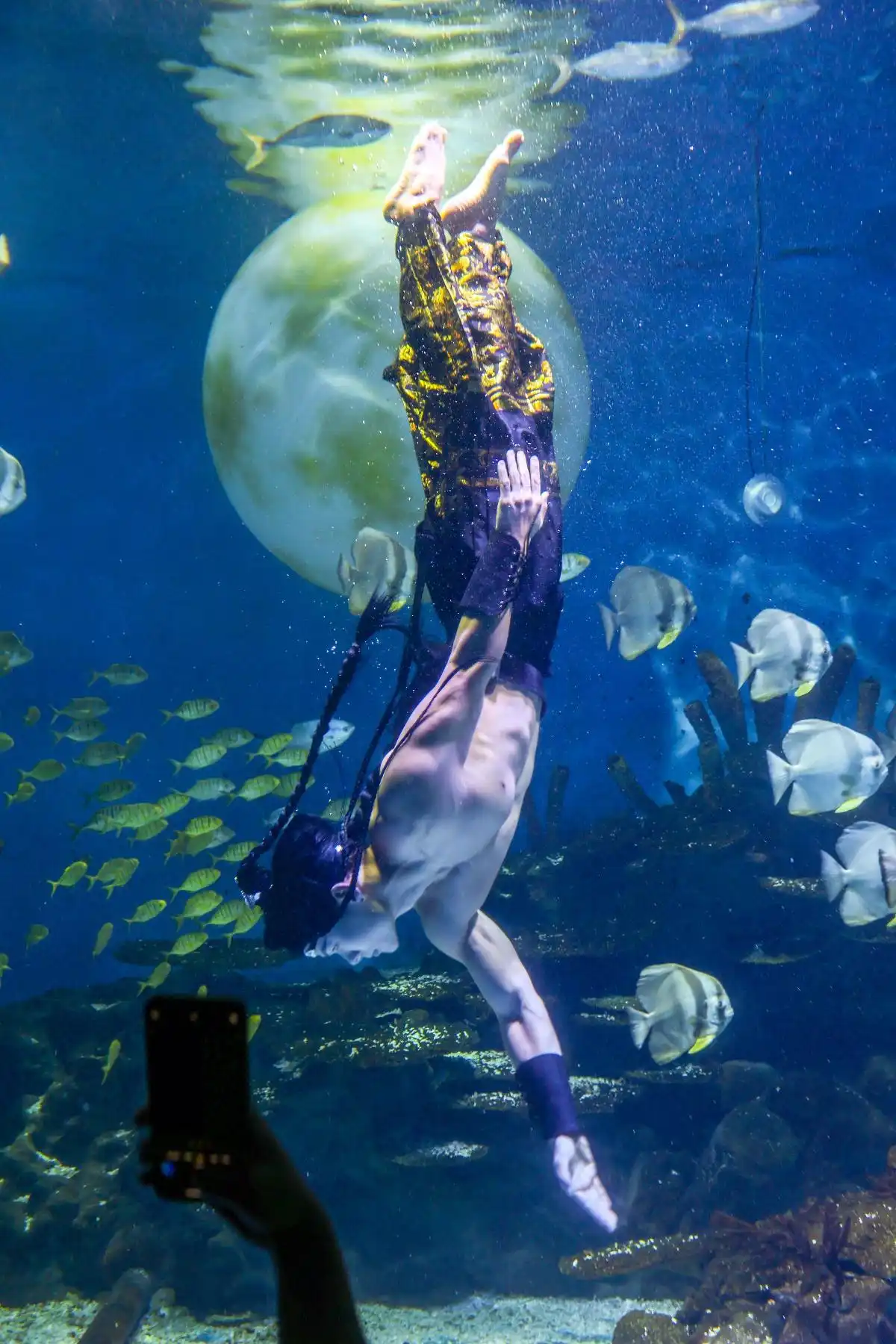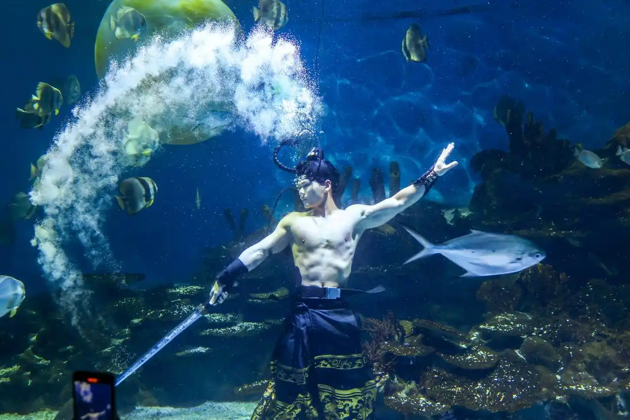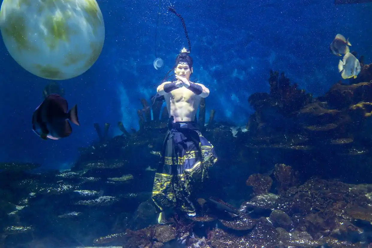 相较于日常的美人鱼装扮,“水下嫦娥奔月和吴刚舞剑”的造型看似只是换了一套衣服,实则暗藏诸多技术难点。“日常表演多以经典美人鱼造型为主,流线型的鱼尾搭配轻盈动作,在水下展现出灵动美感。美人鱼尾是贴合身体的流线型设计,阻力小;但古装的长袍、宽袖在水下会完全展开,每一次摆动都要额外用力,一场20分钟的表演,体力消耗是平时的 1.5倍。”他解释道,为了适应古装的阻力,他提前半年开始针对性训练:调整划水幅度,控制身体平衡,甚至反复测试不同材质古装在水下的飘动效果,避免服饰缠绕影响安全与表演效果。