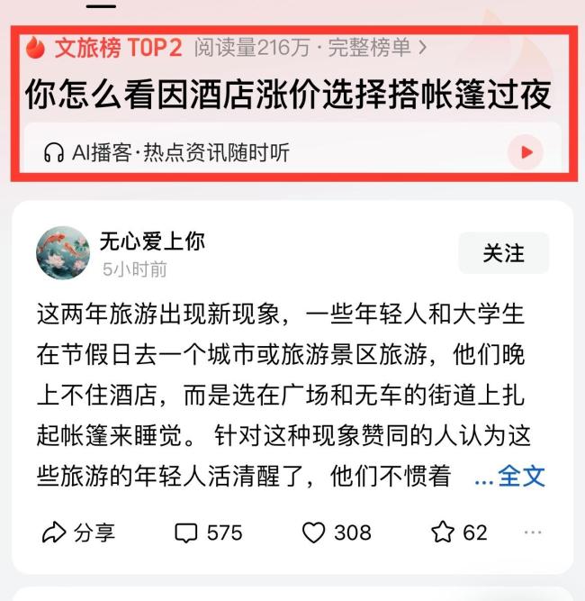 假期过半时,一个热搜话题引起了广泛关注:酒店涨价,年轻人选择露营。特别是一些关于武汉年轻人集体住帐篷而不是住酒店的视频在网络上流传。事实上,这些视频展示的是武汉国庆期间的一个音乐嘉年华活动,年轻人提前几天在路边和公园搭帐篷抢票和位置,并不是因为不住酒店。