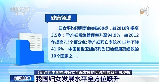 健康领域,妇女平均预期寿命突破80岁,较2010年提高3.5岁;孕产妇系统管理率升至94.9%,较2012年提高7.3个百分点;孕产妇死亡率较2012年下降41.6%,中国被世卫组织列为妇幼健康高绩效的10个国家之一。
