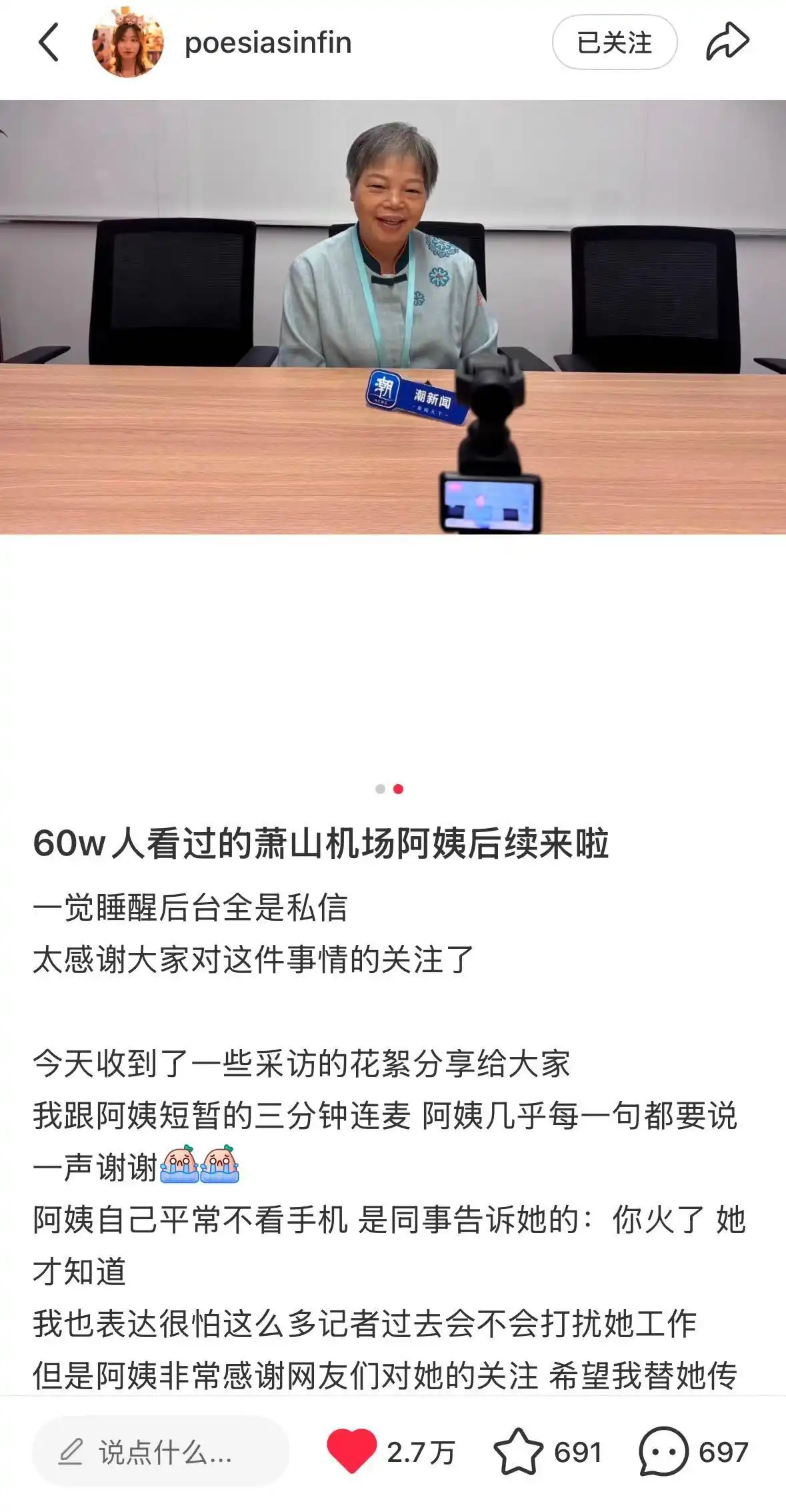刘女士本人在小红书上更新了后续:“我跟阿姨短暂的三分钟连麦,阿姨几乎每一句都要说谢谢。”她表示,打印的相片预计会在本周五前寄到杭州机场。