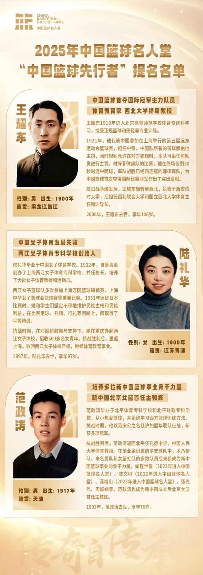 自1895年篮球运动传入中国,在一代代先行者的不懈探索与无私奉献下,中国篮球历经了百余年波澜壮阔的发展历程。中国篮球先行者举荐工作是对中国篮球早期开拓者的崇高致敬,也是对中国篮球传播与发展历程的系统梳理与精神传承。2025年“中国篮球先行者”提名名单已确定:王耀东、陆礼华、范政涛三位进入提名名单。