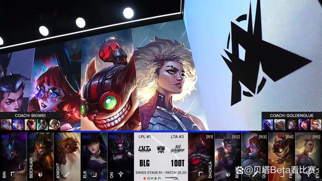 比赛开始时,BLG禁用了波比、芸阿娜、盲僧、扇子妈和飞机,选择了上单挖掘机、打野皇子、中单岩雀、下路女警加蜘蛛;100T则禁用了瑞兹、安蓓萨、发条、妮蔻和琪亚娜,选择了上单赛恩、打野赵信、中单阿萝拉、下路炸弹人加芮尔。